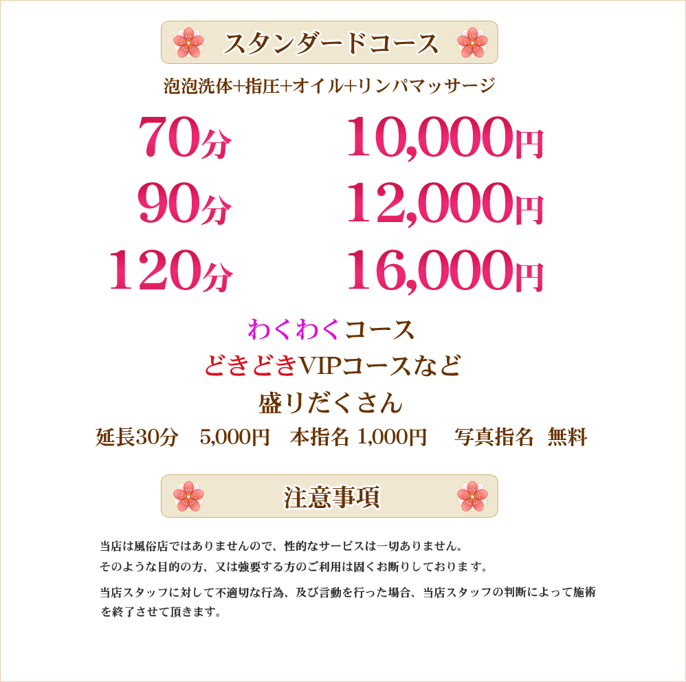また、性的なサービスや回春マッサージを提供するお店ではございませんので、ご理解の上ご利用ください。